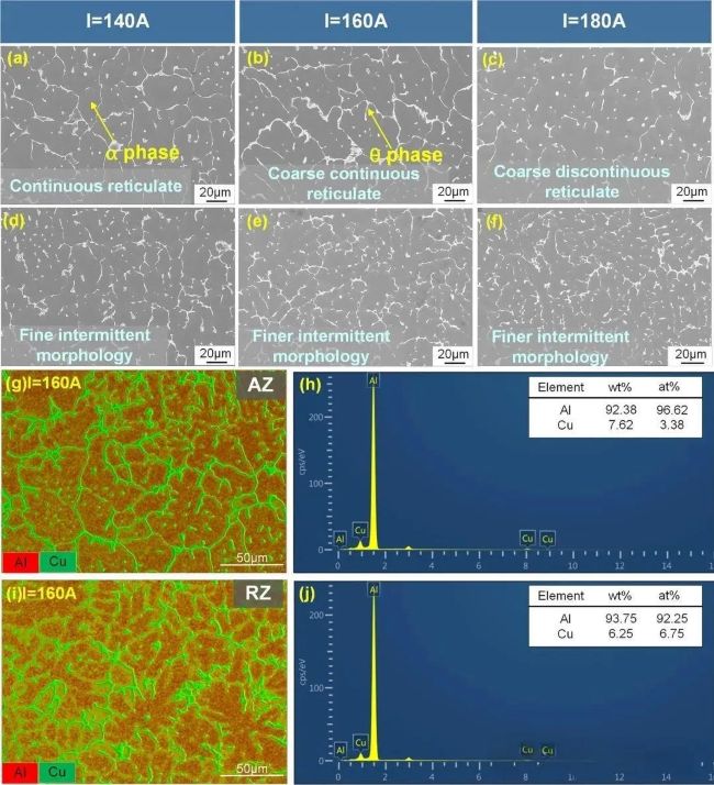 圖9 高倍掃描電子顯微鏡觀察圖像,(a-c) 不同電弧電流下電弧熔化區(qū)(AZ)圖像;(d-f) 不同電弧電流下重熔區(qū)(RZ)圖像;(h-j) 能量色散譜(EDS)映射結(jié)果