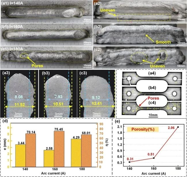 圖4 沉積薄壁件的宏觀成形及孔隙情況,(a1-a4) I=140A;(b1-b4) I=160A;(c1-c4) I=180A;(d) 成形特征統(tǒng)計數(shù)據(jù);(e) 孔隙率統(tǒng)計數(shù)據(jù)