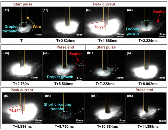 圖5 高速相機觀察到的電弧行為,(a1-b6) I=140A