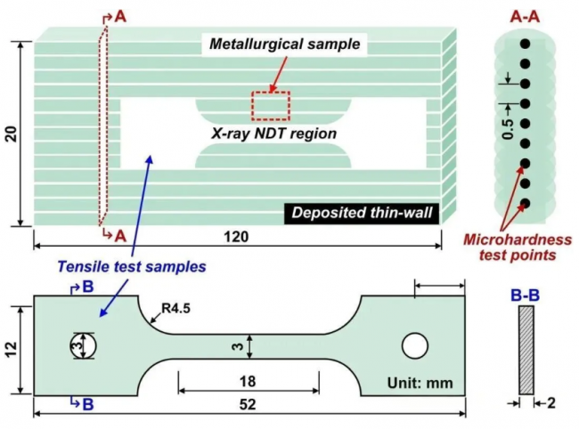 圖2 沉積薄壁件力學(xué)性能測試尺寸示意圖