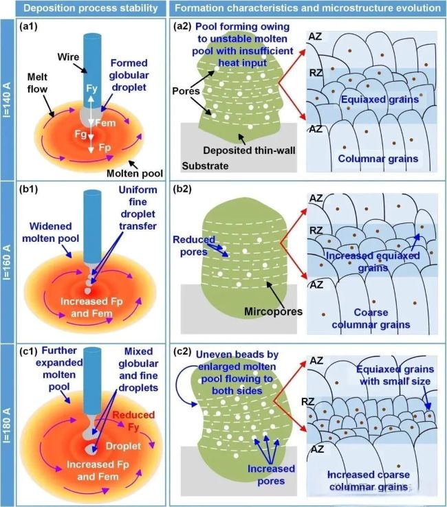 圖17 電弧電流對電弧增材制造鋁合金的影響機理,(a1-a3) I=140A;(b1-b3) I=160A;(c1-c3) I=180A