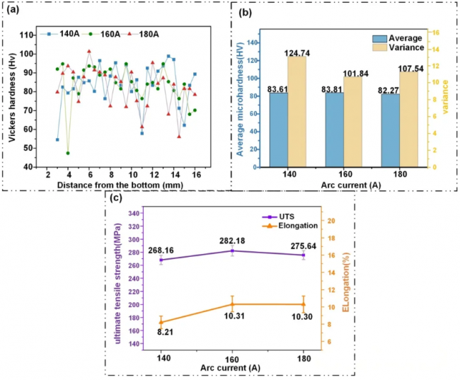盡管增大電弧電流可通過誘導(dǎo)熔滴從球狀向噴射狀轉(zhuǎn)變改善熔滴過渡,并通過柱狀晶向等軸晶轉(zhuǎn)變細化重熔區(qū)顯微組織,但同時會導(dǎo)致電弧熔化區(qū)晶粒粗化。在160A的優(yōu)化電流下,零件獲得了最佳力學(xué)性能,抗拉強度達282.18MPa,伸長率為10.31%,分別較140A時提升了5.23%和25.58%。