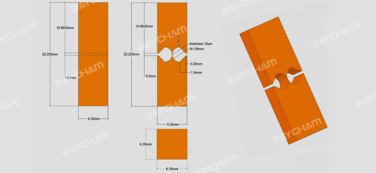 該零件為鈹銅合金材質(zhì),材料厚度6.35mm,需要精確加工兩個(gè)對(duì)稱的圓弧,圓弧最小處的厚度要求在0.03mm以內(nèi)。
